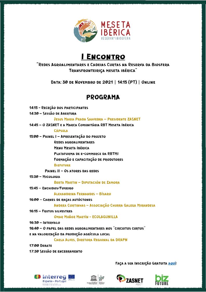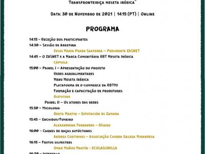 Do programa do evento destacam-se os seguintes temas: A Marca Comunitária RBT Meseta Ibérica, o Menu Meseta Ibérica, a Plataforma de e-commerce da RBTMI, os resultados das ações de formação e capacitação de produtores e os atores das redes de produtos micológicos, enchido e fumeiro, carnes de raças autóctones e frutos vermelhos.